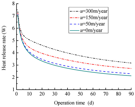 Figure 16 shows the temperature distribution of soil surrounding pipe for the advection velocity of 50 and 300 m/year. It can be found out that the soil temperature field has a migration along the groundwater flow direction. With the increase of groundwater advection velocity, the migration amplitude increases and the temperature of soil around the pipe decreases. This will improve the thermal performance of HSCGHE. As shown in Figure 17, the heat release rate of coil increases as the groundwater advection velocity increases. For example, the heat release rate of coil at the time of 90 days are 2.1, 2.3, 2.7, and 3.2 kW for the advection velocity of 0, 50, 150 and 300 m/year, respectively. The main reason is that the greater the groundwater advection velocity, the more heat is taken away by the groundwater, and the smaller the soil temperature rise degree. This implies that the existence of groundwater advection is conducive to the improvement of thermal performance of the HSCGHE. The greater is the groundwater advection velocity, the better is the thermal performance of coil.
