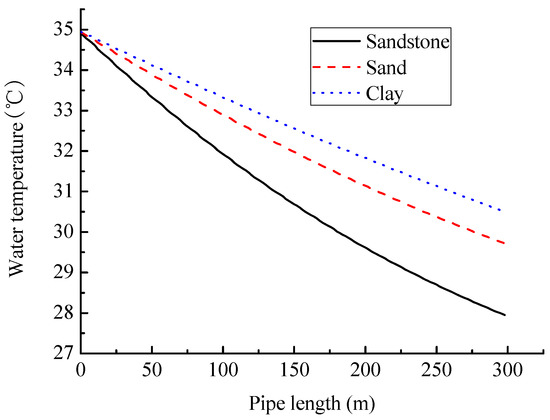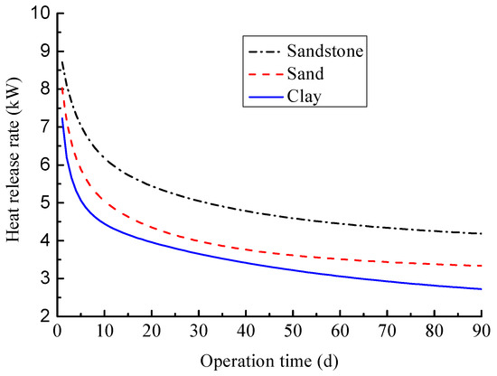 Figure 18 shows the variation curves of heat release rate of coil with time for these three soil types. It can be found that the heat release rate is the largest for sandstone, followed by sand, and the lowest is clay. As shown in Figure 18, when the operation time is 50 days, the heat release rates are 3.2, 3.6 and 4.6 kW for clay, sand and sandstone, respectively. Compared with clay, the heat release rate increases by 12.5% and 43.8%, respectively, for sand and sandstone. The main reason is that the soil with a large thermal conductivity has better heat conduction performance and thus the heat release rate can be improved more effectively. As shown in Table 3, sandstone has the highest thermal conductivity, followed by sand and the smallest is for clay, which results in that the slinky coil with sandstone has the maximum water temperature drop along length direction, followed by sand and clay. As shown in Figure 19, when the operation time is 40 days, the water temperature drops are 4.4, 5.2 and 6.9 °C for clay, sand and sandstone, respectively. This means that sandstone is the best and clay is the worst for improving the thermal performance of coil.