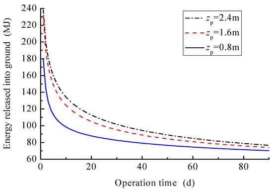 As mentioned above, the thermal performance of coil can be easily influenced by the surface heat exchange conditions due to its shallow buried depth. To further explore the influences of the buried depth on the thermal performance of coil, three depth conditions, 0.8, 1.6 and 2.4 m, are investigated and the calculated results are presented in Figure 20 and Figure 21. Figure 20 shows the variation curves of energy released into ground with operation time for different buried depths. Figure 21 presents the variation curves of water temperature along the pipe length for different buried depths.