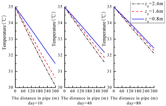 Variation curves of water temperature along the pipe length for different buried depths.
