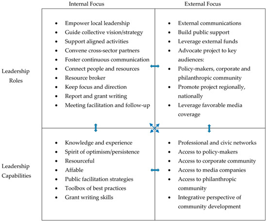 The tabular depiction of backbone leadership in Figure 2 is a simplification of how backbone leadership actually unfolds in the dynamic system of sustainability partnerships. One of the signature roles of backbone leaders from Figure 2, that of a resource broker—connecting people and resources—clearly blurs the boundaries between internal and external leadership roles. The blue arrows in Figure 2 illustrate the dynamic and interactive character of internal versus external leadership roles and capabilities.