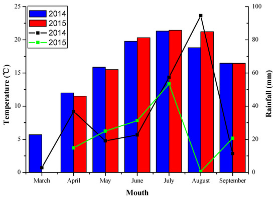 Monthly rainfall and average temperature during growing seasons in 2014 and 2015; the bars represent temperature and the line denotes rainfall.