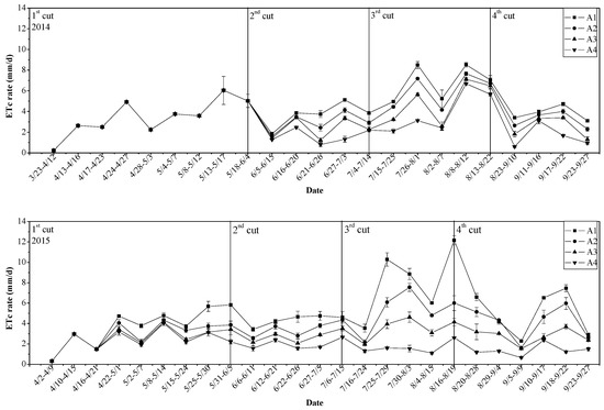 The ETc of the first growth period was a large amount regardless of the irrigation. This situation was due to the winter irrigation at the end of the previous growing season, which maintained the SWC at a good level at the beginning of the growing season, allowing the alfalfa to extract enough water for transpiration from the soil in the early first growth period. The soil water was consumed with the alfalfa growth, resulted in the water deficit condition in the late first growth period as the ETc was lower than the ETr. On the other hand, the longest growth periods receiving more solar radiation and a more effective growing temperature than other growth periods (data not shown) could increase the ETc of alfalfa [36,37]. In 2014, the ETc reached another peak in the third growth period, which was due to the higher daily temperature and rainfall. In the fourth growth period, daily temperatures became cooler and solar radiation decreased, causing the alfalfa to go dormant and the ETc to decrease. During the third growth period in 2015, high daily temperatures and solar radiation were also recorded, but the rainfall was poor compared to the same growth period in 2014, which caused the difference in the ETc in A2, A3, and A4. Irrigation is an important factor which affects the ETc of alfalfa [21,30,31,37]. The decrease in irrigation amount resulted in a water deficit. Under water deficit conditions, rainfall becomes the major factor influencing the ETc [38]. The SWC in A3 and A4 was low after the first growth period, so a low precipitation amount during the third growth period with higher daily temperatures intensified the water deficit, which led to the decrease of the ETc in A2, A3, and A4.