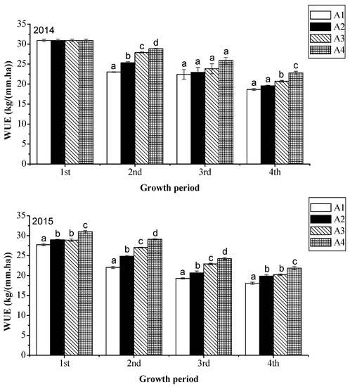 The WUE of different treatments in 2014 and 2015 are presented in Figure 3. The highest WUE was obtained from the A4 treatment, although the greatest yield occurred in the A1 treatment. The average WUE of the different treatments in the two growing seasons were 22.78 kg/(mm·ha) in A1, 24.15 kg/(mm·ha) in A2, 25.31 kg/(mm·ha) in A3, and 26.84 kg/(mm·ha) in A4, respectively. The average WUE of all treatments in each growth period ranged from 20.22 kg/(mm·ha) to 30.04 kg/(mm·ha). The highest average WUE was obtained from the first growth period and decreased with successive growth periods.