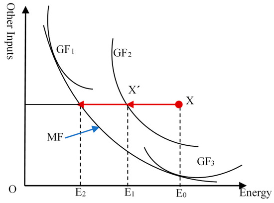Figure 1 provides a graphical illustration of the difference between GEEI and MEEI. The curves represent the production isoquants, i.e., three for group frontiers (GF1, GF2 and GF3) and the last one for metafrontier (MF). We consider a DMU, i.e., X in Figure 1, whose energy is underutilized according to its own groupfrontier (GF2) as well as the metafrontier (MF). In this case, GEEI and MEEI of DMU X can be calculated as the ratio of and the ratio of , respectively.