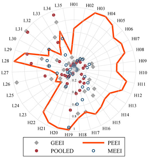 It can be seen that the average values in measuring instruments manufacturing in heavy industry (H19) and furniture manufacturing in light industry (L31) are approximately equal in terms of GEEI. However, in view of MEEI, the average value in H19 stays almost unchanged while that in L31 becomes much smaller. This difference between the two typical sub-industries comes from the metatechnology. That is, the potential energy use technology in H19 is more advanced than that in L31, which leads to a bigger value of PEEI in H19 than that in L31, as shown in Figure 2. Generally, the average values of PEEI in heavy industry are higher than those in light industry, which is in line with Li and Lin [60].