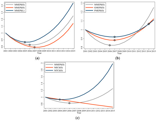 We calculate the cumulative MMEPI and its components according to Equations (27)–(29) for the period of 2001–2005, setting 2001 as the base year. Figure 3 presents the cumulative average trends among different sub-industries in three categories, where “O”, “H” and “L” denote overall industry, heavy industry and light industry, respectively. We can see that MMEPI(O) has experienced a U-shaped change, going downward until 2006 with a minimum cumulative energy productivity of 0.825. From then on, the growth rate of MMEPI(O) becomes positive and peaks in 2015 with a maximum cumulative energy productivity of 1.250. It means that energy productivity in overall industry has increased by 25% during the past fifteen years. In general, this U-shaped development of energy productivity is in line with Du and Lin [1]. Moreover, the turning point of 2006 implies that China’s ECER program seems to take effect.