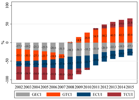Furthermore, Figure 4 describes the dynamic contributions of four components for the cumulative metafrontier Malmquist energy productivity growth with 2001 as the base year. We can see that the cumulative efficiency change components (GECI and ECUI) contribute negatively to energy productivity growth over time, while the contributions of cumulative technological change components (GTCI and TCUI) turn from negative to positive during the sample period. Specifically, TCUI remains the biggest (negative) contributor to energy productivity growth until 2006. After, GECI takes the lead in energy productivity growth for the period of 2007–2010. GTCI begins to dominate the energy productivity growth and maintains ahead in the 12th FYP period.
