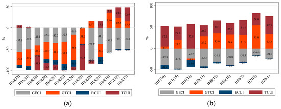 Specifically, in Figure 5a, of 13 sub-industries, GECI makes the biggest contributions to energy productivity growth in eight sub-industries; GTCI takes the lead in four sub-industries; TCUI dominates energy productivity growth only in Measuring instruments manufacturing (H19). Moreover, we can find that GMEPI (GECI and GTCI) controls the energy productivity loss in these sub-industries. On the other hand, in Figure 5b, technological change components become the dominating factor of energy productivity growth with positive contributions except for Communication equipment manufacturing (H18), in which GTCI makes a negative contribution to the growth of energy productivity (−3.4%).