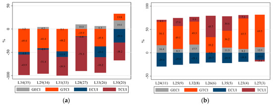 In Figure 6a, technological change components (GTCI and TCUI) contribute most to the energy productivity loss in all sub-industries. Specially, in the three worst productivity performance sub-industries, namely, Culture, education and sport activities manufacturing (L34), Leather manufacturing (L29) and Furniture manufacturing (L31), the total contributions of technological change components are −93.3%, −92.8% and −88.8%, respectively. Recalling those two best productivity performance sub-industries (H20 and H21) in Figure 5b, we can conclude that in those sub-industries technological progress or regress determines energy productivity gain or loss.