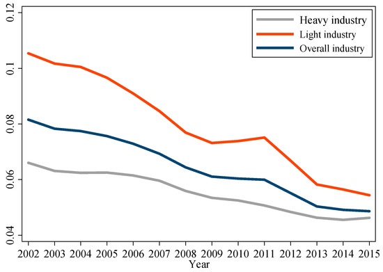 Regarding the heterogeneity across sub-industries, this paper follows the classifications in Fan et al. [46] and Li and Lin [60], where sub-industries are divided into two groups, namely, heavy industry and light industry. The coverage of each industry is noted under Table 1: 23 sub-industries for heavy industry and 12 sub-industries for light industry.