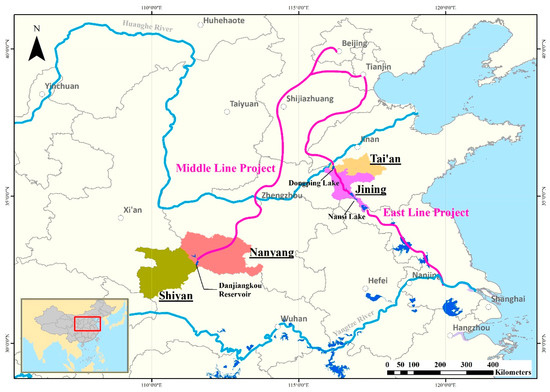 We chose four administrative regions on the Middle and of the SNWDP—Shiyan (SY), Nanyang (NY), Tai’an (TA), and Jining (JN)—as case study areas (Figure 1). SY and NY are located in Hubei and He’nan Provinces and they cover 23,680 km2 and 26,600 km2, respectively. TA and JN are both situated in Shandong Province and have an area of 7762 km2 and 11,187 km2, respectively. SY is adjacent to the NY and JN borders TA. Danjiangkou Reservoir, a direct water source in the Middle Line Project, is situated in rural areas of both SY and NY. Lake Dongping and Lake Nansi, which are indirect water sources in the East Line Project, are located in rural areas of TA and JN, respectively.