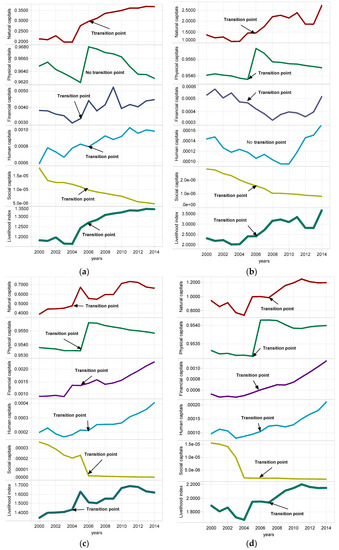 The detection of significant change points indicated that total livelihood indices of SY and NY both occurred in 2006 (Figure 3a,b). Before 2006, the annual average growth rate of rural household livelihood was 1.1%; however, after 2006, it turned into 0.6%. Regarding NY, the variation amplitude on the rural household livelihood was 2.3% before 2006; after that, it turned into a faster positive evolution (3.9%). On the East Line, the change point for TA was in 2004, and for JN was 2007. Before and after the transition years, the average year-by-year change rates of rural household livelihood of TA and JN presented a slower evolution tendency (TA: from 1.3% to 1.1%, JN: from 3.3% to 0.9%). In terms of each type of capital, change points for natural and physical capitals in JN appeared at 2007 and 2005 respectively, while, in 2006, it was for financial, human, and social capitals. Despite such minor differences in the year of transition, the overall livelihood transition year of the JN rural household coincided with the year of natural capitals. This is a case for the other three study areas. This phenomenon indicates that natural capitals have an important and fundamental influence on the livelihood of rural households [20].