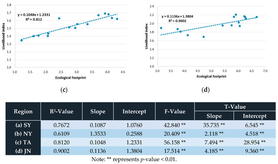 Relationship between rural household livelihood and ecological footprint in four water source areas: (a) SY; (b) NY; (c) TA; and (d) JN.