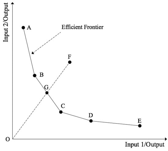 The basic principle of the DEA method is depicted in Figure 1. In the figure, the two axes correspond to the ratios between two different inputs and a single output. The points {A,B,C,D,E,F} are the DMUs under study with F being the DMU to be evaluated. The lower the input-to-output ratio, the more efficient a unit is. The efficient frontier is constructed by fitting linear segments to tightly encompass all DMUs and thus corresponds to the piecewise linear curve A-B-C-D-E. To attain the status of efficiency, the inefficient DMU {F} needs to decrease the ratios between the two inputs and the output. Specifically, DMU {F} can reduce the two input-to-output ratios proportionally along the radial direction on the line OF. We assume OF passes through the frontier at a hypothetical point {G}. The efficiency of {F} is then defined as the ratio of two distances, i.e., OG/OF. The DEA model generalizes the principle of Figure 1 to higher dimensions where a DMU operates on multiple inputs and generates multiple outputs.