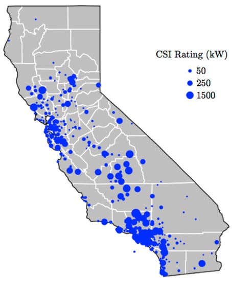 - California Solar Statistics CSI Data Sets. Available online: https://www.californiasolarstatistics.ca.gov/data_downloads/ (accessed on 20 June 2017).