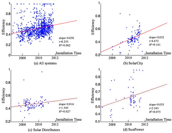 A very interesting finding is that installers as subsidiaries of big oil companies have had bad performance. Most notably, Chevron Energy Solutions and BP Solar have average efficiencies of 0.508 and 0.526, far below the industry average. The results resonate with the downfall of the solar business at BP and Chevron []. In fact, several international oil corporations are known for their venture into renewable energy. BP and Chevron are the two most notable cases and have made substantial investments in solar in the first decade of the 21st century []. BP first entered the solar energy industry in 1980s through acquisition of an existing solar module manufacturer. The company branched into the installation business in California in 2000s. But then BP shut down its solar business including manufacturing and installation in 2011. The CSI database indicates that BP Solar, as BP’s solar arm, has built 31 projects with a total capacity of 12.86 MW. Chevron with its solar subsidiary Chevron Energy Solutions is an even more prominent installer than BP, with 426 installations and a total capacity of 103.68 MW. However, following the footsteps of BP, Chevron closed its solar energy business in 2014. The withdrawal of big oil companies from solar business seems to validate the argument raised by existing research that oil companies are prone to regard renewable energy as a public relation vehicle rather than a sustainable core business asset []. We conjecture that this public relation mentality may impair the organizational support to solar business. Also, being the fringe business, solar departments at BP and Chevron may not come under as much pressure as other installers to excel in operations. Therefore, solar PV systems built by solar branches of oil companies have inferior performances compared to systems built by other installers.