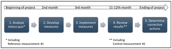 The measures were developed in a participatory approach together with representatives from each department dealing with food supply. Focus groups were applied to learn about the psychological and sociological interrelation of the staff involved [21]. Another reason for choosing this approach was that we wanted employees to become very committed to the project, which we attempted to achieve by creating psychological ownership. As Umble and Umble [22] stated, psychological ownership of ideas is critical to generating true enthusiasm and commitment to the project. By becoming involved, employees were supposed to overcome their personal reservations with regard to the anticipated changes. Instead, they should identify with the measures in order to improve their implementation and to obtain sustainable results, i.e., long-lasting effects in improving resource efficiency. The interdisciplinary teams included a number of different participants. In addition to two researchers (one as moderator, one for record keeping) the following employees took part in the workshops. For the hospital, the team included the head of nursing services, two nurses, two order assistants, a dietician, the hospital kitchen manager, and a representative from the CPK. For the cafeteria, two members of the service staff, the kitchen manager, a representative from the CPK, and one nursing staff member (in the role of a diner at the cafeteria) took part in the workshop. In the retirement home, the kitchen manager, one service staff member, four nursing staff members, the director, the quality manager, and the social worker participated in the workshops. Table 4 summarizes the measures developed in the project. The measures were structured into five categories information, communication, products, processes, and customer needs. These measures were implemented between measurement #1 and #2 (cf. Figure 1).
