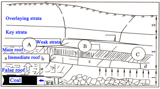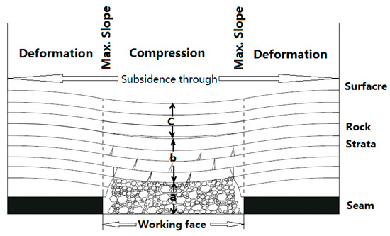 An underground coal mine longwall working face is generally between 200 and 400 m long and the full thickness of the coal seams are excavated by a coal mining machine like a shearer or plow. After the coal seam has been excavated, the roof rock behind the hydraulic supporters becomes unsupported and loose via the following processes [27,28,29,30]: (1) strata pressure load concentrates on the goaf roof and floor due to the absence of coal seam; (2) loosening of the immediate roof and floor strata as the goaf area converges; (3) cracking occurs, especially in the immediate roof strata; (4) stress relief in the main roof strata occurs above the face area; (5) release of gas quantities from neighboring seams and porous enclosing rock happens during stress relief in the seam, floor, and roof areas; (6) collapsing of the roof strata happens, further transmitting to the upper strata; (7) strata stresses increase around the edge of the working face. Based on extended observation, the overburden failure above a longwall collapsing working face can be divided into three areas according to the strata slippage and damage. They are the collapsing area, fracture area, and bending subsidence area, which are shown in Figure 1.