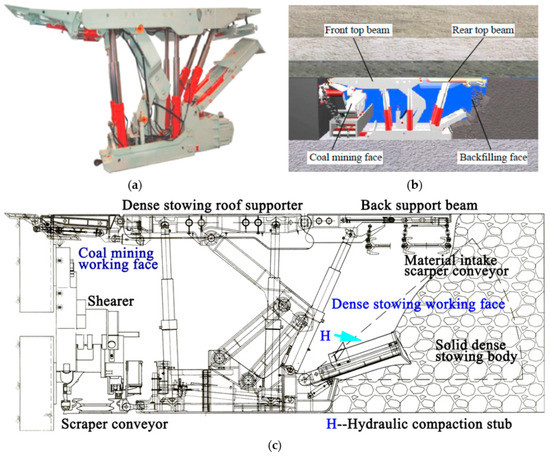 Figure 3b,c shows that the solid dense stowing roof supporter system could realize the coal seam excavation and goaf stowing operation at the same time. At the front of the roof supporter, the coal seam shearer works as a common long-wall working face for coal production. Meanwhile, at the back of the roof supporter system, the goaf spaces after the excavation of coal seam can be stowed immediately before serious fracture development occurs in the roof and overburdens the strata. This effect has been realized through three main technological innovations: reliable manipulation equipment and enough operational space; adequate stowing/compaction power, which is realized through hydraulic tamping; as well as the stowing material supply and transportation with high efficiency.