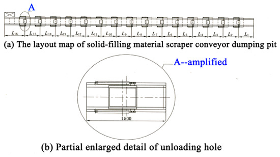 Design of dumping pits on the scraper conveyor (a) and its detail (b).