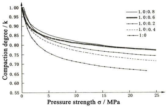 Figure 8 shows that the compaction rate k of stowing material and axial pressure/stress were nonlinearly related. At the beginning of compaction (σ ≤ 5 MPa), the compaction rate k decreased rapidly. Along with further increasing of pressure, the k value decline tended to occur more and more slowly, and gradually reached a stable value. Even distributed gradated gangue material has the best compaction properties, the reason could be the gangue particles with well distributed particle sizes could occupy the spaces between larger particles as much as possible and led to lower porosity of the dense stowing medium. With the increasing of gangue/fly ash proportion in stowing material up to 1:0.6, the compaction properties of dense stow material tended to achieve the best status, since the spaces between gangue particles were fully filled. Further increasing fly ash content could not optimize the compaction rate any more, since until 1:0.6, all spaces between gangue particles had been fulfilled by fly ashe i.e., the porosity of the dense stowing medium had been reduced to the minimum and the compaction properties depended on the aggregate material i.e., the gangues.