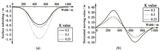 Figure 9 shows that both of the surface subsidence and horizontal movement raised significantly with the increasing of K value i.e., decreasing of the compaction rate k. The variance of dense stowing material proportion/gradation had very little influence on surface subsiding range.