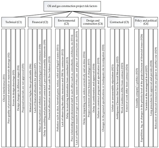 Energy demand is rising, and it is anticipated that worldwide investment in energy-related projects will reach $38 trillion through 2035 [1,2]. In the discussions of sustainable development, energy is one of the key factors that must be considered [3,4,5]. OGC projects are composed of high levels of risk because of intensive investment, numerous stockholders, complex technology, and unique nature [6,7]. These risks can be economic, political, social, and technical in nature, as well as related to the natural environment and natural disasters [8,9]. Recognizing the risk related to energy is not only a construction market need, but also it is important to the upstream as well as downstream oil and gas industry sub-sectors [10]. Construction projects play a key role in the sustainable oil and gas supply chain and processing [11,12]. Due to this importance, governments of developing countries are under pressure to ensure that projects will be finished on time with least amount of risk and uncertainty [13]. A proper risk management strategy leads to lower costs and increases competitiveness in the energy market [14]. Therefore, it’s necessary to identify and assess the major risks faced by OGC projects, in order to help companies that plan or work in such projects develop plans to ensure sustainable energy supply chains. Furthermore, recognizing, highlighting and analyzing the important risk factors associated with OGC companies can assist in proper planning, successful implementation of risk management and appropriate responses to eliminate, transfer or control the corresponding risks.