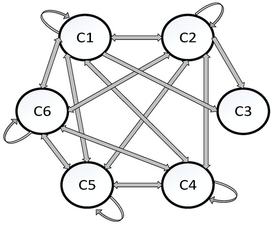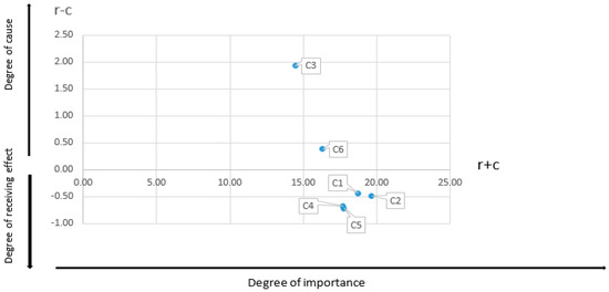 A causal diagram can be plotted (Figure 4) by using dataset () and (), which are given in Table 4. As shown in Figure 4, all risk factors were divided into both cause and effect clusters. The effect cluster was comprised of C1, C2, C4, and C5 with negative values of (), whereas the cause cluster included C3 and C6 with () positive values. It can also be seen that C3 was the highest causal factor while both C4 and C5 were the highest effect factors. In addition, both C1 and C2 were identified as the most important factors as they demonstrated high levels of interrelationship with other factors.