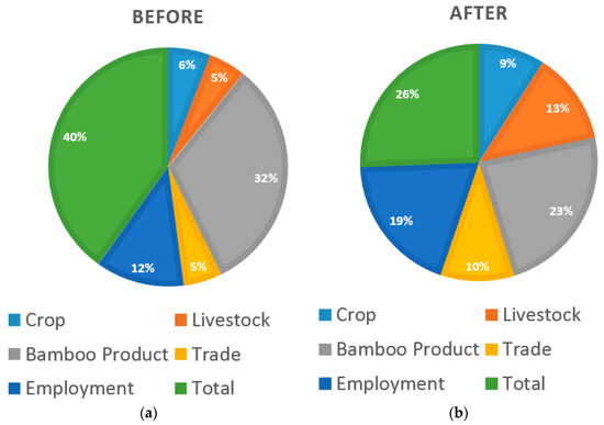 The distribution of income received from various enterprises in relation to average total income, as recorded in household interviews with Bo Hon Villagers in 2010 (n = 46): (a) Before resettlement; (b) After resettlement.