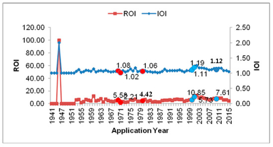 Based on Figure 4, the ratio of open innovation (ROI)—i.e., the width of open innovation—which signifies the ratio of jointly applied patents among all other patents, generally underwent fluctuations, but an overall increase was achieved, although it faltered slightly in the late 2000s [27]. The intensity of open innovation (IOI)—i.e., the depth of open innovation—which signifies the average number of joint applications per patent, also saw fluctuations and began to show faint signs of slowing down near 2010.