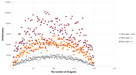 Time span means the total time (tick number of interactions between (I) and (O)) when the number of the population and the number of (I) are decided. There are three time spans: 50, 200, and 800. Time scale 𝑘 means the change speed of revenue according to time.