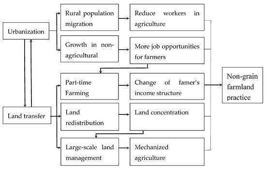 This research is based on the theoretical framework presented in Figure 1, which conceives that NGF practice is intimately linked to the urbanization and farmland transfer in China. It also reflects the interrelation between rural land use and development of the rural economy. Urbanization influences non-grain farmland (NGF) through two processes. On the one hand, rural population migrates to cities, which reduces agricultural labor force. Rural households may thus need to adjust their grain production behaviors according to the amount of labor force and farmland area. On the other hand, industrial growth creates more job opportunities for farmers, who will adjust their grain production behaviors by comparing their income before and after engaging in non-agricultural employment. Therefore, the influence of urbanization on NGF can be measured by urbanization rate (UR) and the shares of secondary and tertiary industries output value in total regional GDP (SOVSTI) (Table 1).