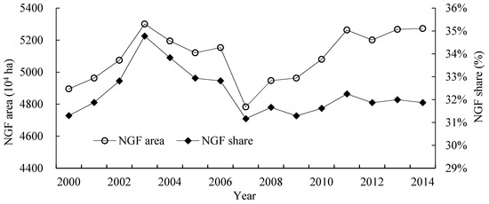 Both NGF area and share showed positive spatial autocorrelation and had a remarkable clustered spatial pattern. The spatial patterns of NGF area and share witnessed great changes from 2000 to 2014, especially the High-High and Low-Low areas. NGF area had remarkable spatial agglomeration and the High-High area moved from central China to southwestern China. The Low-Low area of NGF area decreased sharply in western China and expanded toward the northeast. The Low-High area of NGF area was close to the High-High area, without distinctive spatial pattern. The spatial agglomeration in NGF share intensified from 2000 to 2014. The High-High area increased significantly in the Pearl River Delta, Guangxi, and Guizhou, whereas it declined greatly in central China, with spatial agglomeration in a few cities in eastern Hubei Province. The Low-Low area witnessed continuous expansion in northeastern China and gradually decreased in southern Tibet and central Shanxi Provinces, and finally agglomerated mainly in northeastern China and western Shanxi Province.