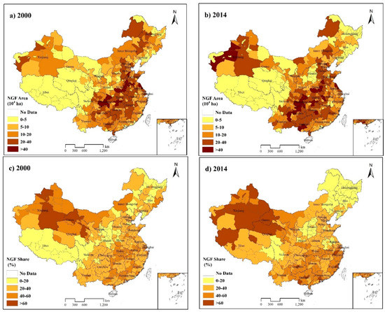 The share of NGF also differed greatly between the cities, but it had a different spatial pattern when compared to that of NGF area. In 2000, the NGF share of 11 cities was more than 60%, and these cities were mainly distributed in Xinjiang, Qinghai, and Gansu Provinces (Figure 3c). Shenzhen had the highest NGF share of 94.8%. In 2014, the number of cities with more than 60% of NGF share increased to 32, and these cities were mainly distributed in Xinjiang, Tibet, and Qinghai Provinces. Some cities in Guangdong, Fujian, and Zhejiang Provinces also had higher than 60% of NGF share (Figure 3d). Shenzhen still had the highest NGF share of 99.8%. The number of cities with an NGF share of 40–60% increased notably from 83 in 2000 to 99 in 2014. It expanded from the junction of Xinjiang, Qinghai, and Inner Mongolia as well as around the junction of Hunan and Jiangxi Provinces in 2000 to Zhejiang, Fujian, Hunan, Hubei, Guangxi, Guangdong, Guizhou, and eastern Yunnan in 2014. The number of cities with an NGF share of 20–40% dropped notably from 188 in 2000 to 151 in 2014. The number of cities with an NGF share less than 20% remained the same 63 in 2000 and 2014, but the spatial pattern changed greatly. The NGF share in most cities in Ningxia and Tibet Provinces increased greatly, whereas the NGF share in northeastern China, Shanxi, and Anhui Provinces decreased dramatically. The spatiotemporal changes of NGF share had two features. First, the number of cities with an NGF share more than 40% increased significantly. Second, the spatial agglomeration of NGF share intensified.