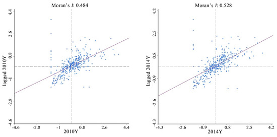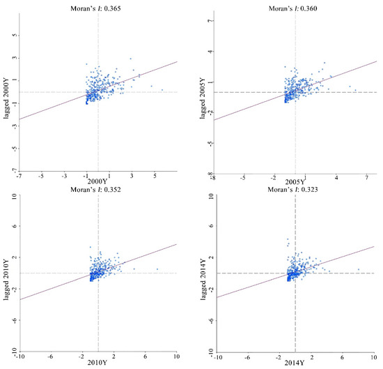 Moran scatter plots of NGF area in 2000, 2005, 2010, and 2014.