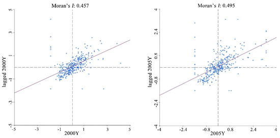 Global spatial autocorrelation analysis was performed by means of Moran’s I statistic and its visualization in the form of a Moran scatter plot in this study. The Moran scatter plots of NGF area in 2000, 2005, 2010, and 2014 are shown in Figure 4, which reflect changes in the spatial pattern of NGF area. The global Moran’s I of NGF area was 0.365 (p = 0.001) for 2000, which decreased to 0.360 (p = 0.001) for 2005 and 0.352 (p = 0.001) for 2010, and decreased to 0.323 (p = 0.001) for 2014. All the global Moran’s I of NGF area in these four years are significant at the 0.01 level. They indicate significantly positive spatial autocorrelation and have a remarkable clustered pattern. The Moran scatter plots of NGF share in 2000, 2005, 2010, and 2014 are shown in Figure 5. The global Moran’s I of NGF share presented an overall upward trend from 0.457 (p = 0.001) for 2000 to 0.495 (p = 0.001) for 2005, but it decreased to 0.484 (p = 0.001) for 2010 and then increased to 0.528 (p = 0.001) for 2014. All of the global Moran’s I of NGF share in these four years are significant at the 0.01 level. They also had significantly positive spatial autocorrelation and have a remarkable clustered pattern.