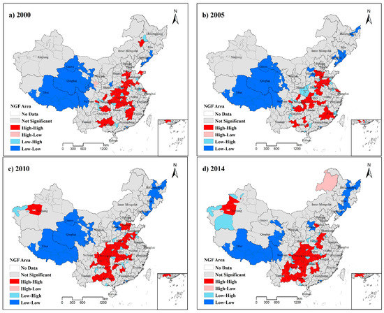 Local indicator of spatial autocorrelation (LISA) cluster map of NGF area. (a) LISA cluster map of NGF area in 2000; (b) LISA cluster map of NGF area in 2005; (c) LIAS cluster map of NGF area in 2010; (d) LISA cluster map of NGF area in 2014.