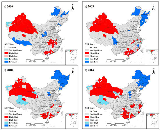 Figure 7 shows the spatial patterns of municipal-level NGF share in 2000, 2005, 2010, and 2014 respectively in China. Similar to the spatial patterns of NGF area, the spatial patterns of the NGF share changed tremendously over these 15 years. The High-High and Low-Low areas presented the largest changes in spatial pattern. In 2000, the High-High area covered 39 cities, which were located in Xinjiang, junction of Qinghai, and Gansu, junction of Hubei, Hunan, and Jiangxi as well as junction of Guangxi and Guangdong (Figure 7a). In 2005 and 2010, the High-High area decreased considerably at the junction of Hubei, Hunan, and Jiangxi, whereas the High-High area increased to some extent at the junction of Guangxi and Guangdong, and changed slightly in Xinjiang and at the junction of Qinghai and Gansu (Figure 7b,c). In 2014, the High-High area covered 51 cities. Zhejiang showed new agglomeration regions (Figure 7d). The High-High area increased significantly in the Pearl River Delta, Guangxi, and Guizhou, whereas it declined greatly in central China, with spatial agglomeration in only a few cities in eastern Hubei Province. The Low-Low area also witnessed great changes. In 2000, the Low-Low area covered 25 cities, which were located mainly in southern Tibet, central Shanxi Province, and some cities in Heilongjiang Province (Figure 7a). In 2000 and 2005, the Low-Low area expanded continuously in northeastern China, but decreased gradually and finally disappeared in southern Tibet and central Shanxi Provinces (Figure 7b,c). The Low-Low area covered 44 cities in 2014, located mainly in northeastern China (Heilongjiang, Jilin, and the eastern region of Inner Mongolia) and western Shanxi Province (Figure 7d). The High-Low and Low-High areas were scattered, but they did not have a distinctive spatial pattern. Overall, the trend of spatial agglomeration in the NGF share intensified during this period.