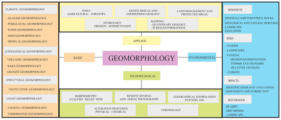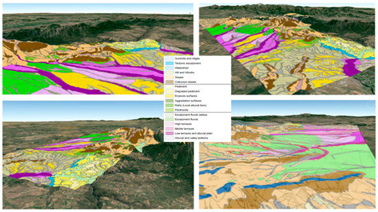 Geomorphological cartography constitutes a fundamental tool to define and interpret the evolution of the landscape of a given region, allowing its past, present, and even future evolution to be determined from its erosive and depositional forms. Geomorphological cartography studies forms of relief from an interpretative point of view, analyses the causes that have generated the processes and forms, and their interrelation and evolution in balance with the other factors of the natural environment [1]. Geomorphological cartography began to be developed in Europe in 1960 using geometric or morphographic techniques. In the 1970s, there was a boom as a cartographic technique to include genetic aspects that provide information about the genesis or origin of the different geomorphological units [2]. The analysis of the generators of the relief and their actions allows knowledge of the morphodynamics of the different geoforms, being able to know the different landscapes that have been developed in each region and to establish their relative evolution in time from the relative or absolute morphochronology. At present, there is no single methodology that establishes the procedure of the elaboration of the geomorphological cartographies, which gives rise to each public or private organism and equipment of investigators having a different method and cartographic legend. In the last decades, the geological–geomorphological features of a territory have been the basis to define homogeneous units of action, integrating with other environmental factors in the elaboration of natural resource planning and management plans. Landscape research with geomorphological criteria to establish spatial units such as the Commonwealth Scientific and Industrial Research Organisation (CSIRO) land units [3,4], generated from basic thematic maps or parametric, synthetic cartography and interpretives. The analysis of the landscape from precise morphogenetic domains has on some occasions allowed for reconstructions of paleoclimatic and paleogeographical natures, which identify the evolutionary phases of the relief with time, as is the case of the geomorphological studies applied to archaeology, palynology, or coastal evolution [5].