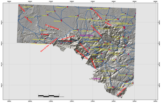 Main mountains and ranges of the study area (red colour) with the urban areas (yellow colour) and main roads (blue colour).