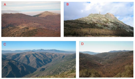 The Iberian Massif presents a remarkable topographic unit defined by large surfaces of levelling that concern all its lithological diversity. This uniformity is interrupted by the presence of some residual reliefs, generally constituted by quartzite alignments of major or minor importance, which represent the main structural lines of the Spanish Iberian Massif and stand out clearly in the landscape, forming mountain ranges. Alpine tectonics causes the massif to break into blocks, resulting in the individualization of large and small basins and depressions [27,28]. This study area is focused on the spurs of the Central Spanish System, in the south of the province of Salamanca and of the Autonomous Community of Castile and León (Figure 2).