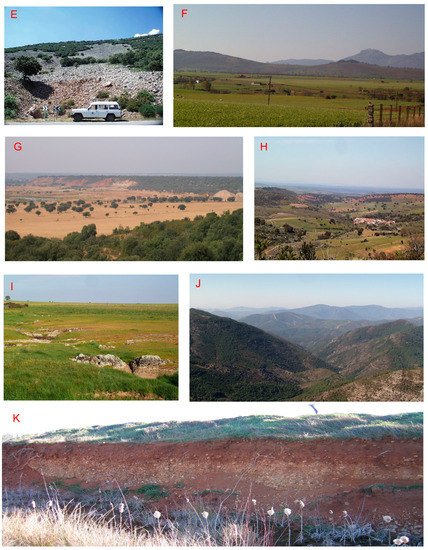 This pediment constitutes an erosive form of polygenic morphogenesis that occupies large cartographical extensions. It is located at the base of all the reliefs in the zone, and it is characterized by being free of sediments, since it constitutes a relict surface now exhumed. It corresponds to an etchplain surface previous to the Neogene and Paleogene that at some point was the base for the thick alteration mantles that covered it. The dismantlement of these altered rocks at the end of the Mesozoic and during the Paleogene and Neogene made these pediments remain exhumed and submitted to all of the subsequent processes of weathering and erosion [40]. This pediment is characterized by a soft, undulating landscape in which the pediment’s domain corresponds to the flat surfaces that form the high parts of these waves, whereas the degraded pediment’s domain corresponds to all of the smooth hillsides located between the flat surfaces and the lower parts of the waves in the area (Figure 7I).