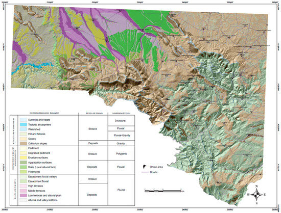The geomorphologic units obtained are then classified according to the types of forms they constitute—erosive and depositional—and bearing in mind the process or set of processes responsible for the genesis of every form or morphogenetic system (structural, fluvial, gravitational, and polygenic—Table 1), being simplified in 18 geomorphologic domains.