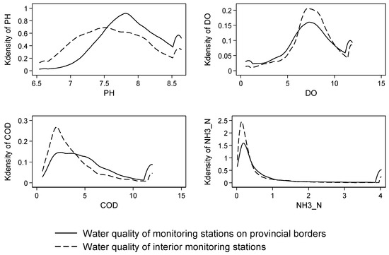 OLS is used to test the impact of monitoring stations near the provincial boundary on water quality, considering all of the control variables to control for confounding factors. The results of the inter-group difference test and OLS estimation for the presence of boundary pollution are shown in Table 4, from which we can find that the water quality of the monitoring stations on provincial borders is worse than that of interior monitoring stations. The deviation of the pH value from the normal value in the water of monitoring stations on provincial borders is greater than that of the interior monitoring stations, and the trend is increasing. The DO value in the water at the provincial boundary monitoring stations is lower than that of the interior monitoring stations overall, which has been strengthened by 2011 and will begin to weaken after 2011. The COD value of the water at the provincial monitoring stations is higher than that of the interior monitoring stations, but the difference in COD value is decreasing during the 11th Five-Year Plan and the 12th Five-Year Plan periods. The NH3-N value in the water at the provincial monitoring station is higher than that of the interior monitoring stations and the difference of NH3-N value is increasing before 2011 but decreasing during the 12th Five-Year Plan period.