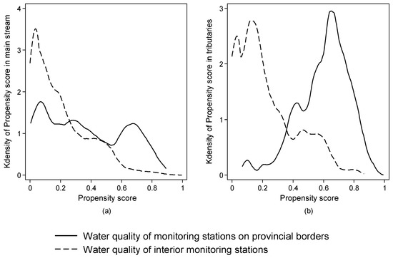 Propensity score in main stream and tributary. Notes: (a) Propensity score of monitoring stations on provincial borders are significantly different with those of interior monitoring stations in main stream. (b) Propensity score of monitoring stations on provincial borders are significantly different with those of interior monitoring stations in tributaries. The distribution of propensity score of monitoring stations on provincial borders varies greatly in main stream and tributary when we compare (a) with (b).