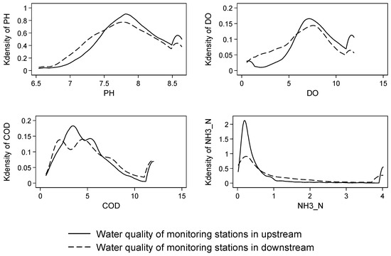From the Figure 4 and ATE shown in Table 8, the difference between the upstream monitoring stations and the downstream monitoring stations is significant, and the upper monitoring stations have a better water environment overall. The relationship between the water quality upstream and downstream has changed dramatically over time. The DO value of the downstream stations is higher in the 10th and 11th FYPs, but this phenomenon was reversed during the period of the 12th FYP. The COD value of the downstream stations was significantly lower than that of the upstream stations in the 10th and 11th FYPs, but the value of the downstream stations was higher during the period of the 12th FYP. The NH3-N value of the downstream stations gradually worsened in contrast to that of upstream stations during the 10th and 11th FYPs but improved during the period of the 12th FYP. Similar trends can be found in OLS and difference tests as a reference. The water quality of upstream monitoring stations is worse than that of downstream monitoring stations, and this phenomenon is deteriorating in the 10th and 11th FYPs. The water quality of the downstream monitoring stations is worse than that measured by the upstream monitoring stations during the period of the 12th FYP.