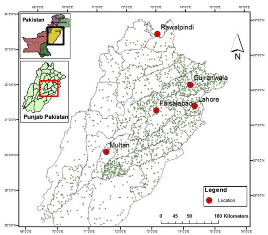 Map of the studied area showing the locations of the five cites of Punjab, Pakistan.