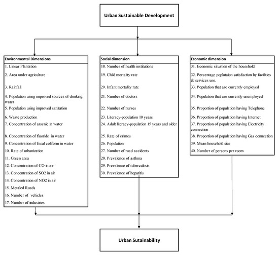 After the industrial revolution, people started to move rapidly to urban areas [1]. Only 10% of the world’s population lived in urban areas in 1900; now, that percentage exceeds 50%, which will increase to 69% by 2050. Only 3% of the world surface is covered with cities and responsible for 75% consumption of world energy, 60% use of residential water, 80% emissions of greenhouse gases and 76% use of wood for industrial purpose. Urban centers have been recognized for the provision of economic growth and development opportunities, education, health care facilities, and social services, which also give better chances for cultural and political participation [2,3,4]. Apart from all these opportunities for human development and progress, the environment of cities is deteriorating [5,6]. Due to economic, industrial, social and corporate activities, the environment of cities become unhealthy. In addition, competition among the people for resources also triggers the socio-economic problem like public safety, increasing unemployment, social segregation and crime rate that affect the urban quality of life [7]. These problems are the barriers for sustainable development where proper planning, checks and balances were not properly implemented. From this perspective, sustainability of urban centers must be taken as an important step both in science and policy arenas.