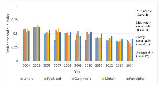 Trend of the environmental dimension (sub-index) for five cities of Punjab, Pakistan.
